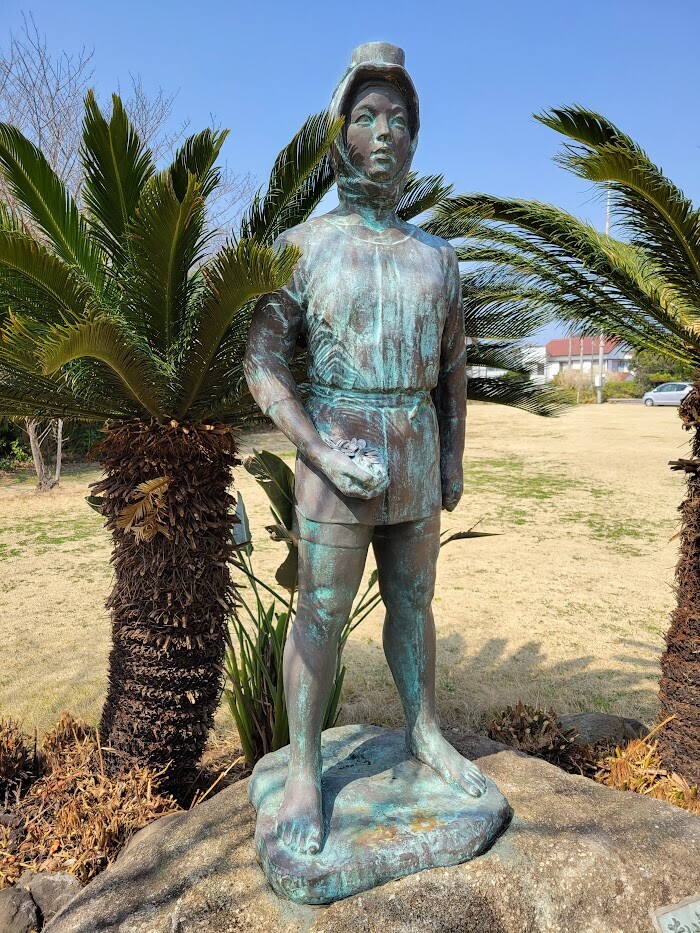 この地は、下立松原神社に太刀を献上して再起をかけ、復興を成し遂げた源氏・源頼朝公や里見義実公ゆかりの場所。全ての出発点から21世紀に向けて飛翔していく願いを込めた”トビウオ”らしい。白浜漁協が設置したとの事。