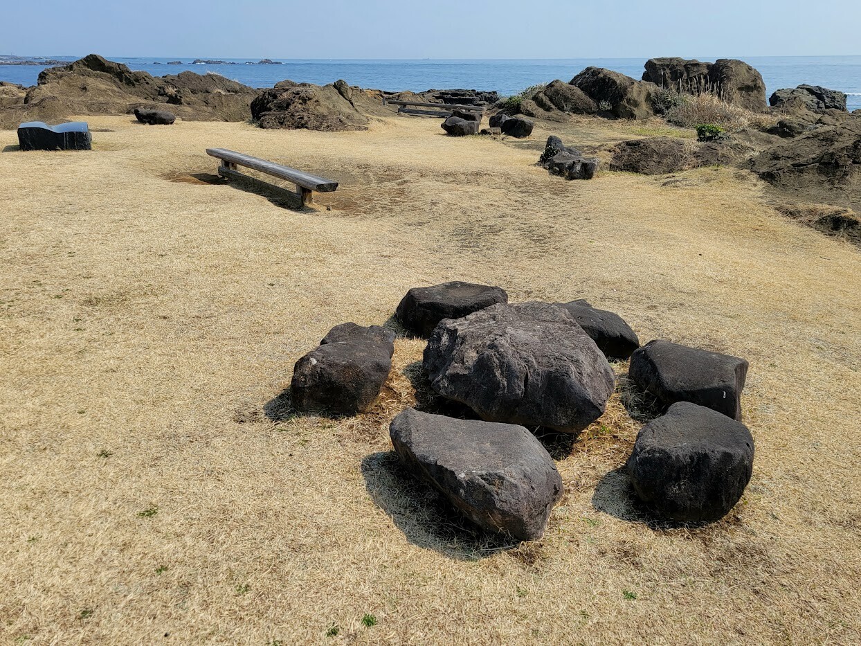 磯場の小高い岩の上にポツンと置かれた白いベンチ。『白浜野島崎園地』の映えスポットの一つです。
